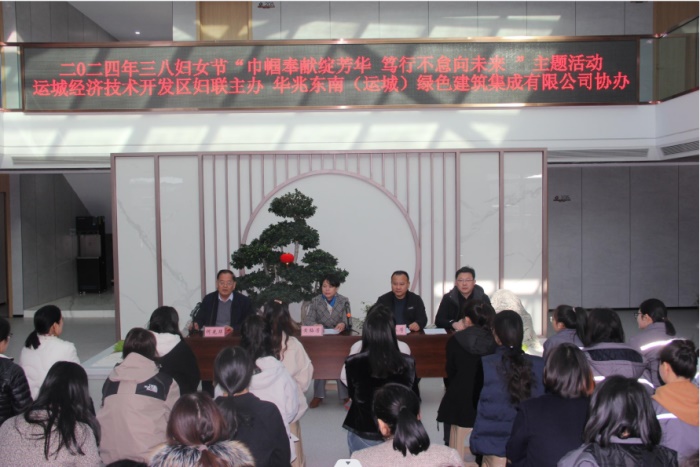 陽春三月天,春花展新顏。3月8日,為慶祝第114個(gè)“三八”國際婦女節(jié),弘揚(yáng)時(shí)代精神,展示巾幗風(fēng)采,由運(yùn)城經(jīng)濟(jì)技術(shù)開發(fā)區(qū)婦聯(lián)主辦,華兆東南綠建承辦的“巾幗奉獻(xiàn)綻芳華 篤行不怠向未來”活動(dòng)在裝配式建筑產(chǎn)業(yè)基地召開。開發(fā)區(qū)黨工委副書記黃梅芳,人力資源部部長何光華,華兆東南綠建總經(jīng)理王永學(xué)等參加此次活動(dòng)。